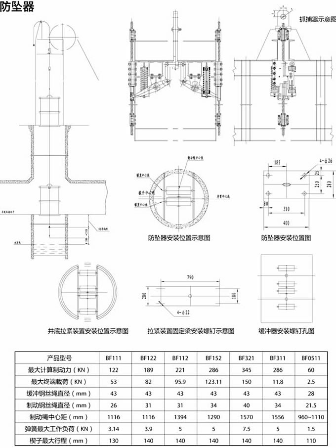 防墜器是單繩提升中的一種重要安全設備。在提升過程中,由于某種原因,提升鋼絲繩段繩或連接裝置斷裂,它能自動抓住制動繩,使罐籠平穩停住,不致墜入井底,從而保證人員的安全和提升設備不致損壞。