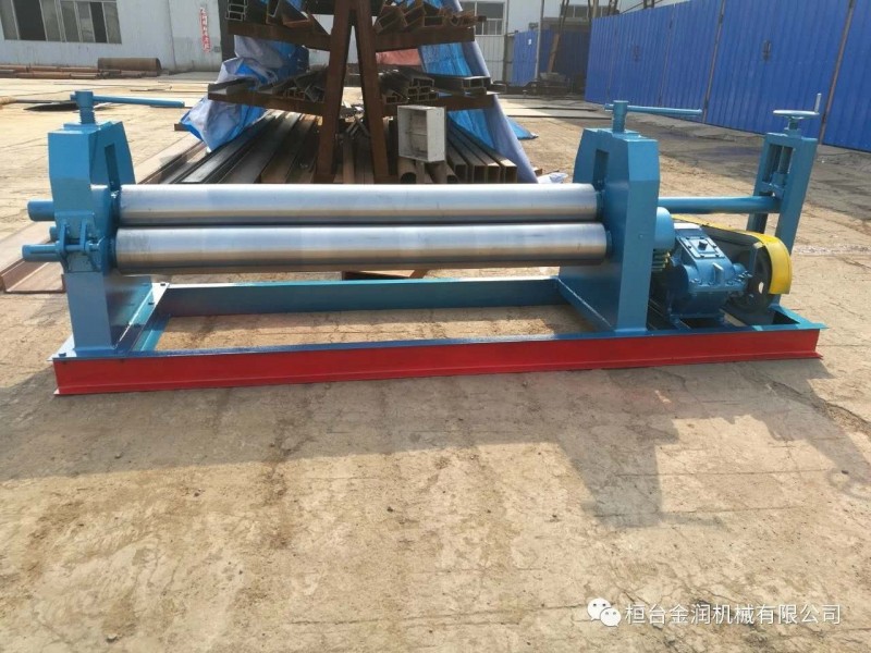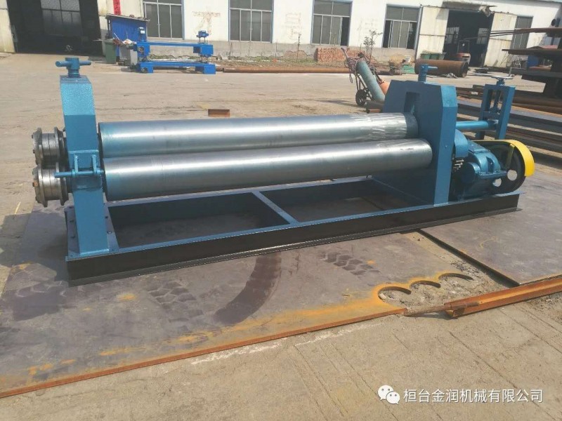 半自動(dòng)卷板機(jī),該機(jī)結(jié)構(gòu)式為三輥對(duì)稱(chēng)式,上輥在兩下輥中間對(duì)稱(chēng)位置作垂直升降運(yùn)動(dòng),通過(guò)人工擰動(dòng)絲桿使上輥垂直升降,兩下輥?zhàn)餍D(zhuǎn)運(yùn)動(dòng),通過(guò)減速機(jī)的輸出齒輪與下輥齒輪嚙合,為卷制板材提供扭矩。上輥可分離取料手動(dòng)升降起輥。
